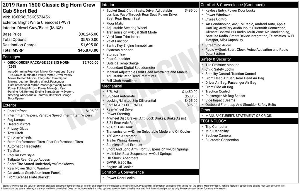 *Detailed*, Alloy Wheels, * Backup Camera, * Bluetooth®, * Apple CarPlay / Android Auto, Auto-Dimming Exterior Mirrors, Auto-Dimming Rear-View Mirror, Big Horn Badge, Big Horn Regional Package, Bright/Bright Billets Grille, Class IV Receiver Hitch, Cloth 40/20/40 Premium Bench Seat, Cluster 7.0 TFT Color Display, Dual Rear Exhaust w/Bright Tips, Exterior Mirrors Courtesy Lamps, Exterior Mirrors w/Supplemental Signals, Front Fog Lamps, Glove Box Lamp, Leather Wrapped Steering Wheel, LED Bed Lighting, Overhead Console w/Garage Door Opener, ParkSense Ft/Rr Park Assist System, Power Heated Fold-Away Mirrors, Power-Folding Mirrors, Quick Order Package 26S Big Horn, Radio: Uconnect 4C w/8.4 Display, Rear Dome w/On/Off Switch Lamp, Rear Floor Mats, Rear Power Sliding Window, Remote Start System, Security Alarm, Steering Wheel Mounted Audio Controls, Sun Visors w/Illuminated Vanity Mirrors, Universal Garage Door Opener, Wheels: 20 x 8 Aluminum Chrome Clad.