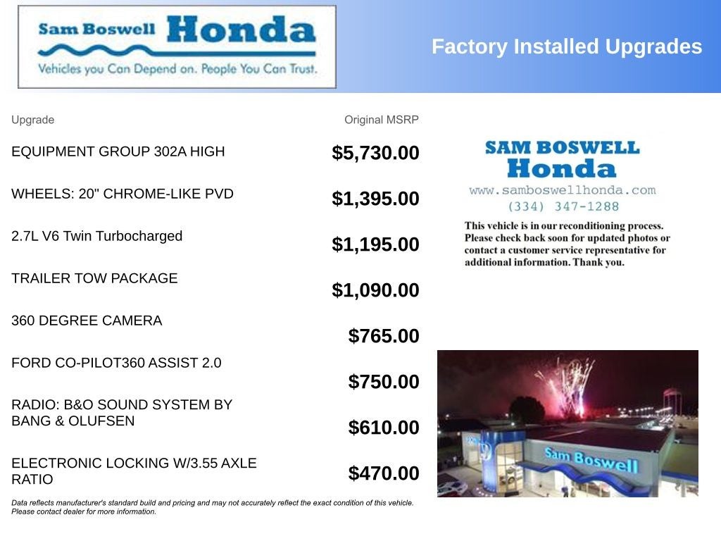 *Detailed*, Alloy Wheels, * Heated Seats, * Backup Camera, * Bluetooth®, 10-Way Power Driver & Passenger Seats, 8 Productivity Screen in Instrument Cluster, Class IV Trailer Hitch Receiver, Connected Built-In Navigation, Dual Zone Automatic Temperature Control, Equipment Group 302A High, Evasive Steering Assist, Ford Co-Pilot360 Assist 2.0, Heated Front Seats, Integrated Trailer Brake Controller, Intelligent Access w/Push Button Start, Intelligent Adaptive Cruise Control w/Stop & Go, Intersection Assist, Leather-Wrapped Steering Wheel, LED Box Lighting w/Zone Lighting, LED Reflector Headlamps, LED Sideview Mirror Spotlights, Onboard 400W Outlet, Power Glass Heated Sideview Mirrors, Pro Trailer Backup Assist, Radio: B&O Sound System by Bang & Olufsen, Rear Under-Seat Storage, Remote Start System w/Remote Tailgate Release, SYNC 4 w/Enhanced Voice Recognition, Trailer Tow Package, XLT Chrome Appearance Package.